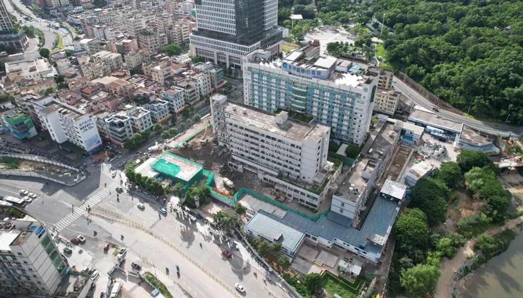 作为观澜片区重要的三级甲等综合医院,龙华区中心医院门诊楼建于1992年,承担着周边百万居民及产业工人的基础医疗、急诊急救及重大公共卫生事件救治重任,更是深圳市急救网络核心节点。原门诊楼被鉴定为危楼亟需重建,但若沿用传统建造模式,周边居民将面临漫长的就医“空窗期”。